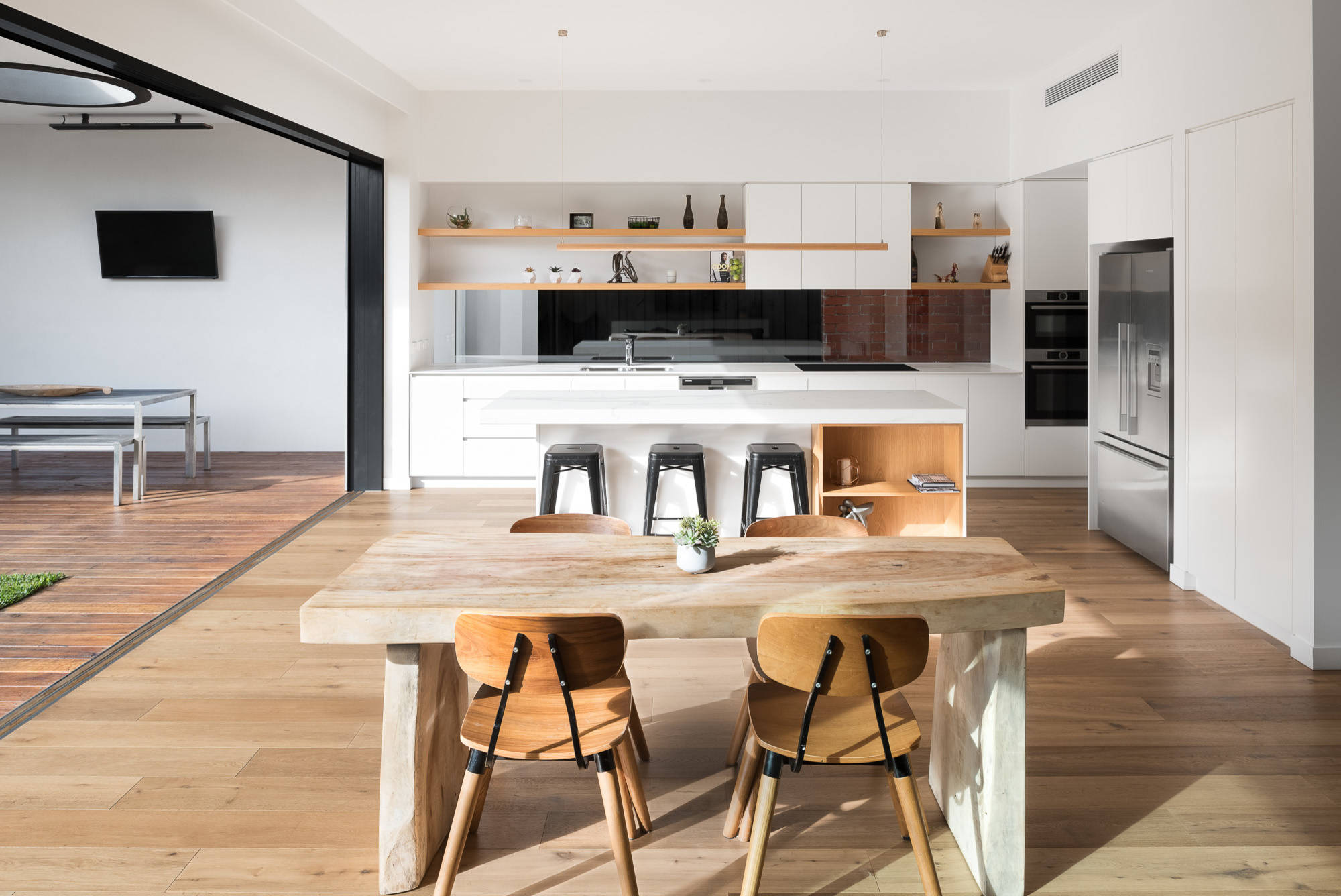 Engineered timber brings warmth to open-plan living and can be refinished after years of dinners.